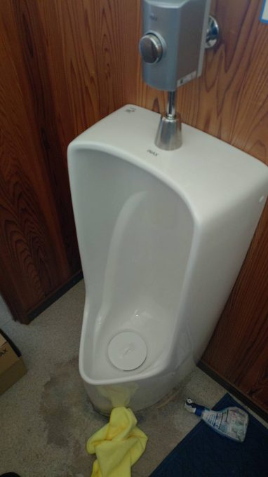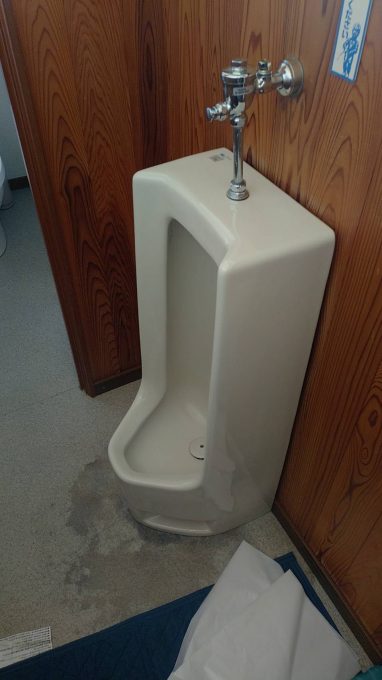既存小便器の取り外しを行い、排水管の割れなどないか確認してから、新しく小便器の交換をさせていただきました。