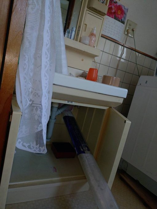 洗面台を外してから、折れた止水栓の残りを給水管から取り除き、新しい洗面台と止水栓を取り付けて終わりました。