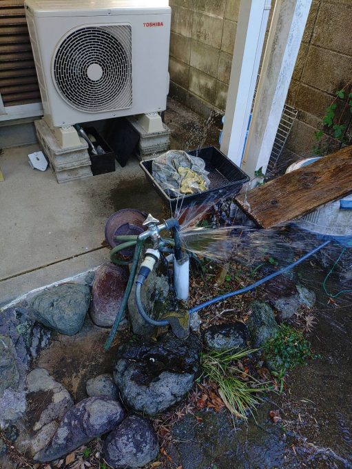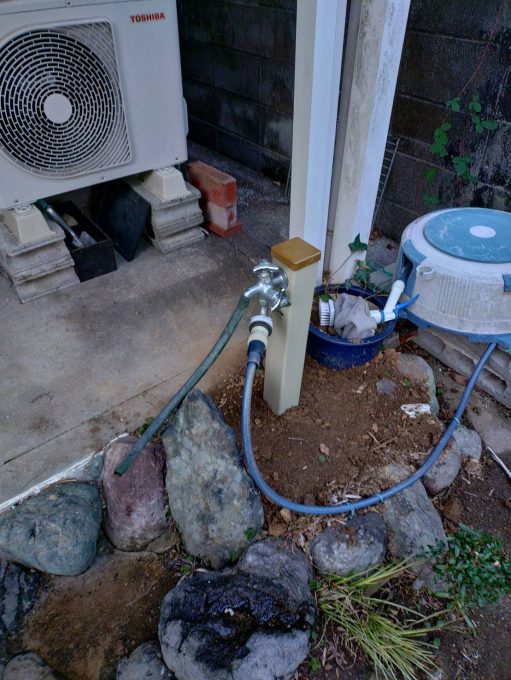 庭の水栓柱の水道管がヒビ割れしていて、水が噴き出していました。